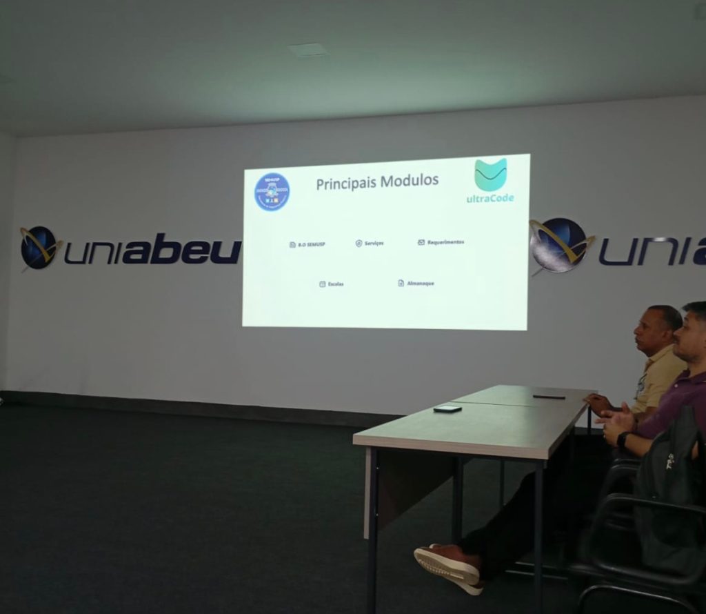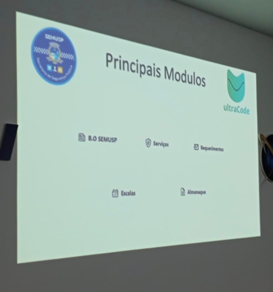 Durante a apresentação, foram demonstrados os módulos principais do sistema — B.O SEMUSP, Serviços, Requerimentos, Escalas e Almanaque —, que integram a ferramenta desenvolvida pela empresa UltraCode.